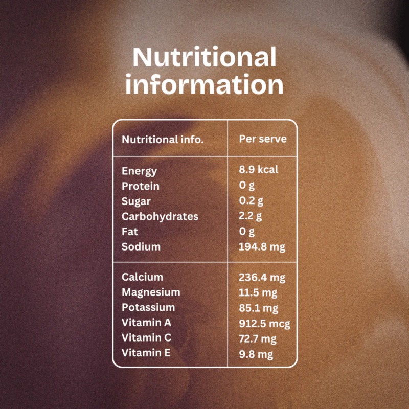 | Nutrition (per sachet) | Energy: 8.9 kcal Protein: 0 g Sugar: 0.2 g Carbohydrates: 2.2 g Fat: 0 g Sodium: 194.8 mg Calcium: 236.4 mg Magnesium: 11.5 mg Potassium: 85.1 mg Vitamin A: 912.5 mcg Vitamin C: 72.7 mg Vitamin E: 9.8 mg |